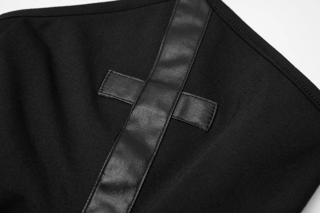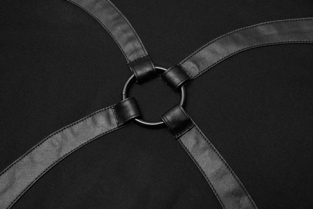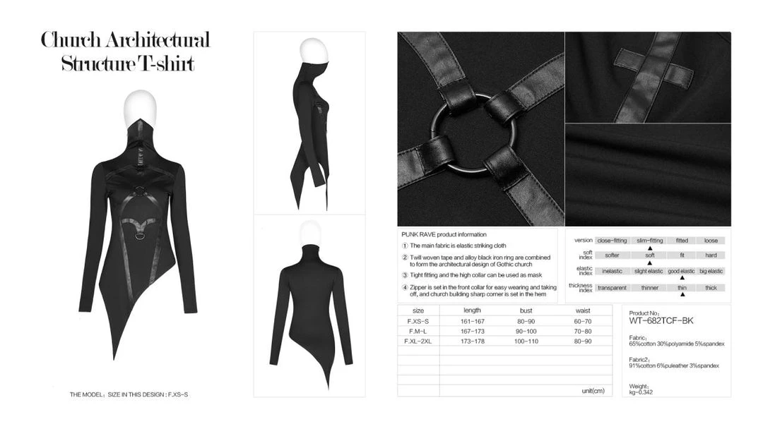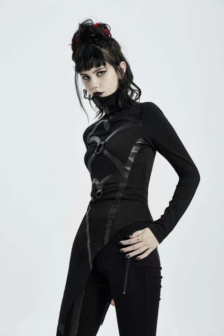 Lovely asymmetric top from Punk Rave featuring long sleeves and faux leather detailing with O-ring and D-ring accents. Fastening with a concealed zip to the side of the overly high neckline which can be used as a face covering. For the perfect fit please see Punk Rave’s size guide in the images.