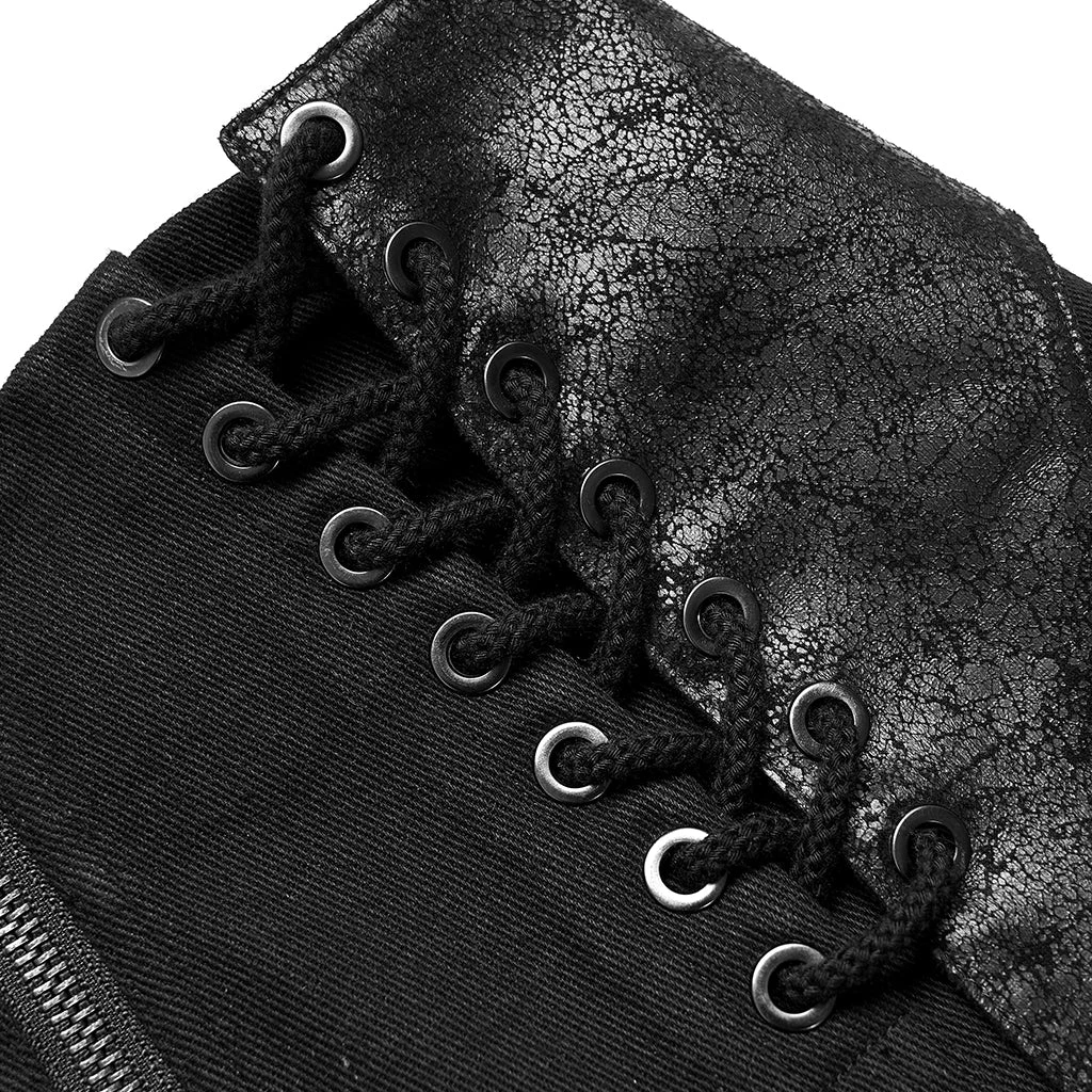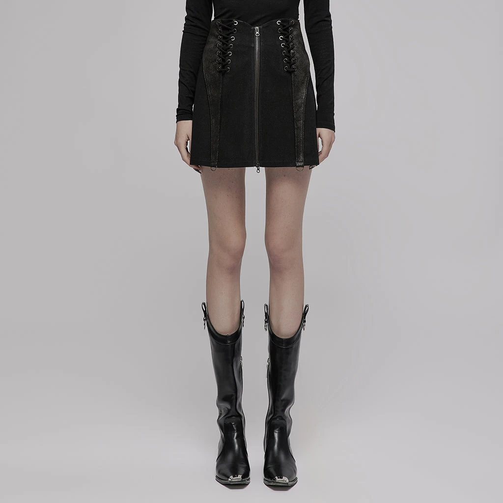 Striking black mini skirt from Punk Rave. This skirt features a high waist, back pocket and full front zip. This stunning mini skirt also features black lace up detailing and metal D rings on faux leather panels for added visual impact!