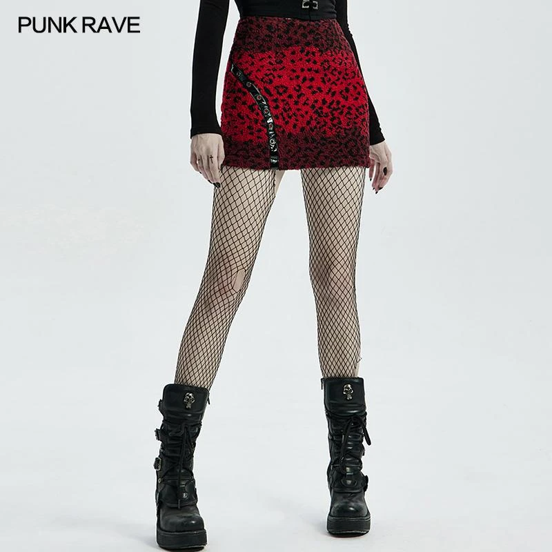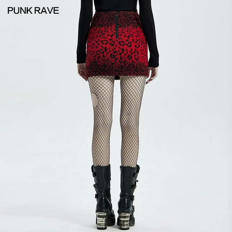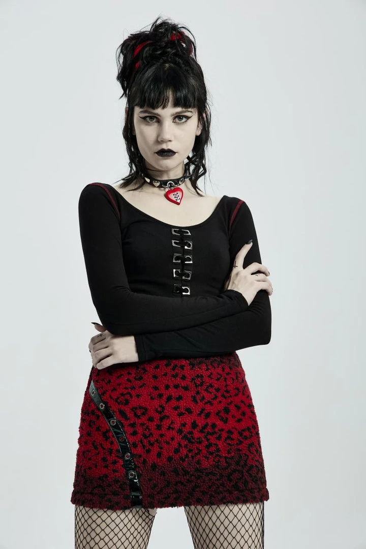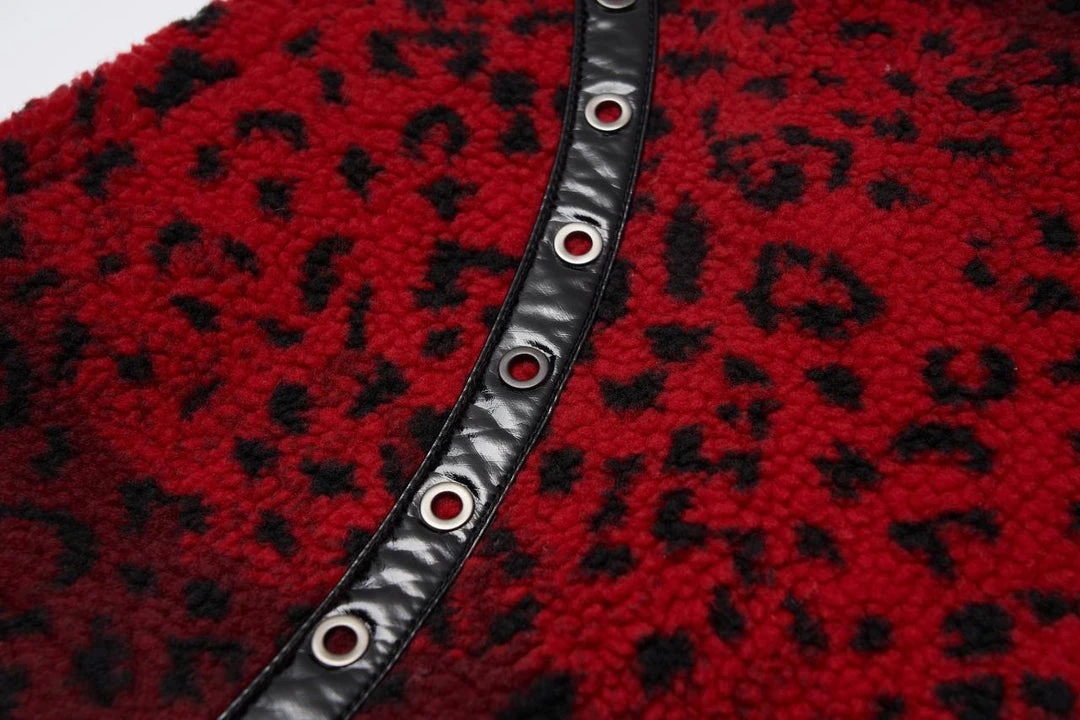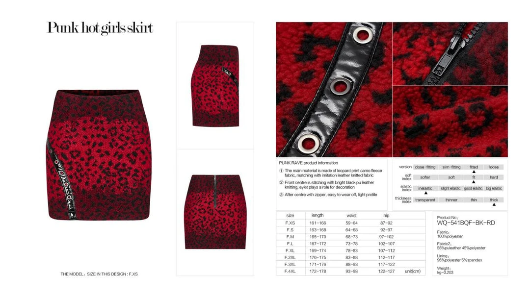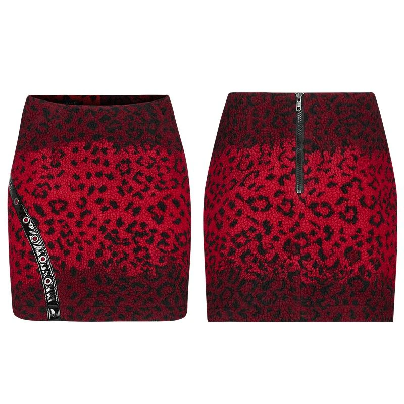 Stunning fleece mini skirt from Punk Rave in a striking red leopard print. Fastening with an exposed black zip to the back, this lovely fitted skirt has front pockets and a faux patent accent with eyelets. For the perfect fit please see Punk Rave’s size guide in the images.