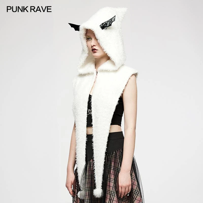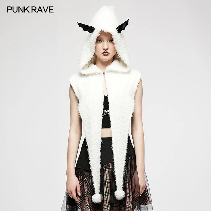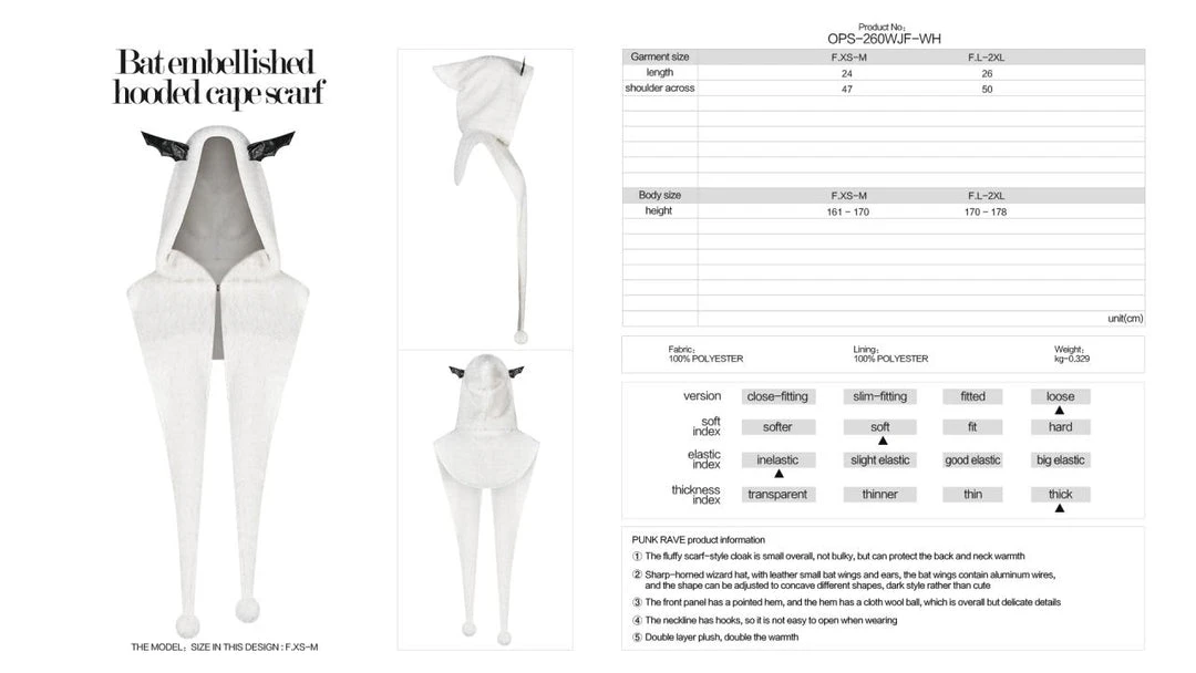 Super cute accessory from Punk Rave! This gorgeous hooded capelet has adjustable black batwing ears, a pointed hood and super soft pom poms. For the perfect fit and fabric composition, please see Punk Rave’s size guide in the images.
