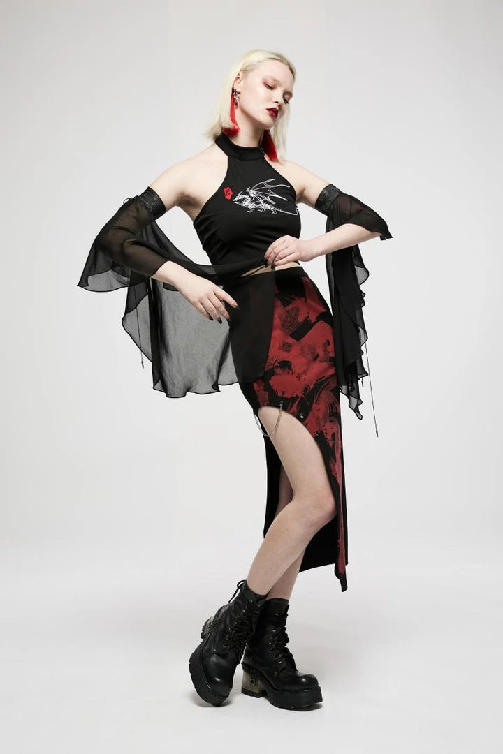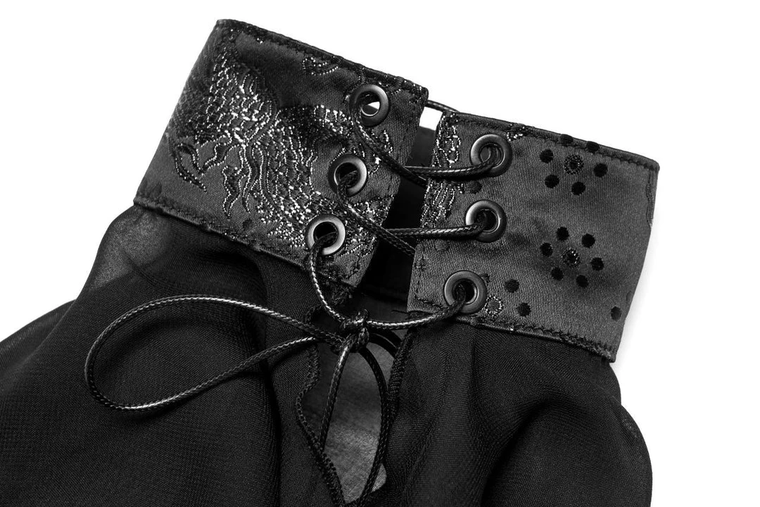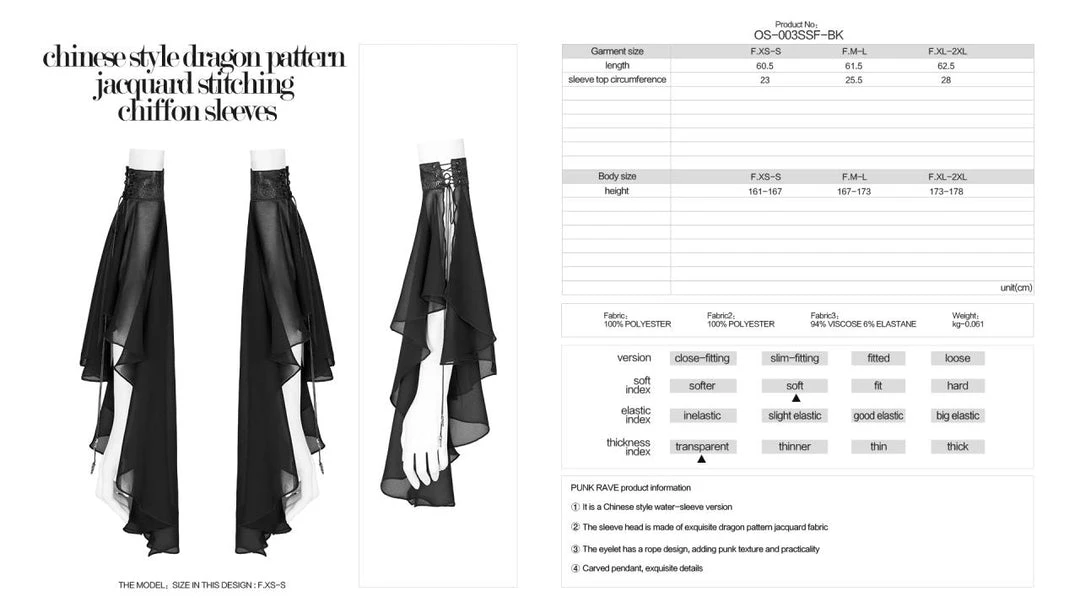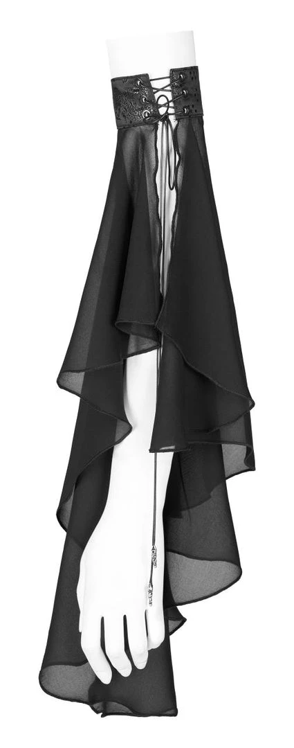 These gorgeous chiffon sleeves from Punk Rave look amazing on. Fastening on the upper arm with laces to the dragon jacquard fabric, these lovely sleeves have long flowing chiffon in a high/low design. For the perfect fit and fabric composition, please see Punk Rave’s size guide in the images.