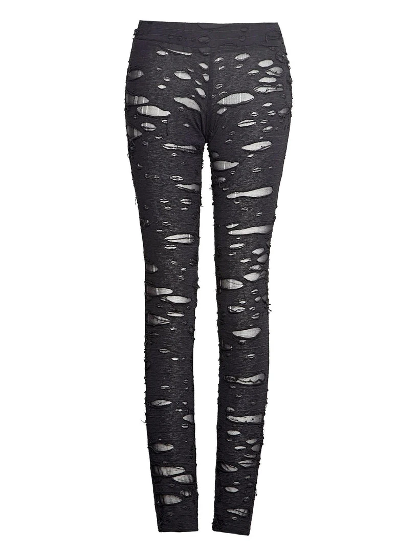 The stunning gothic black Lara leggings from Punk Rave are covered in black mesh backed distress rips and tears. These figure-hugging gothalyptic leggings look amazing on. Inseam measures approximately 32″ and a wide elastic waistband adds to the comfort.