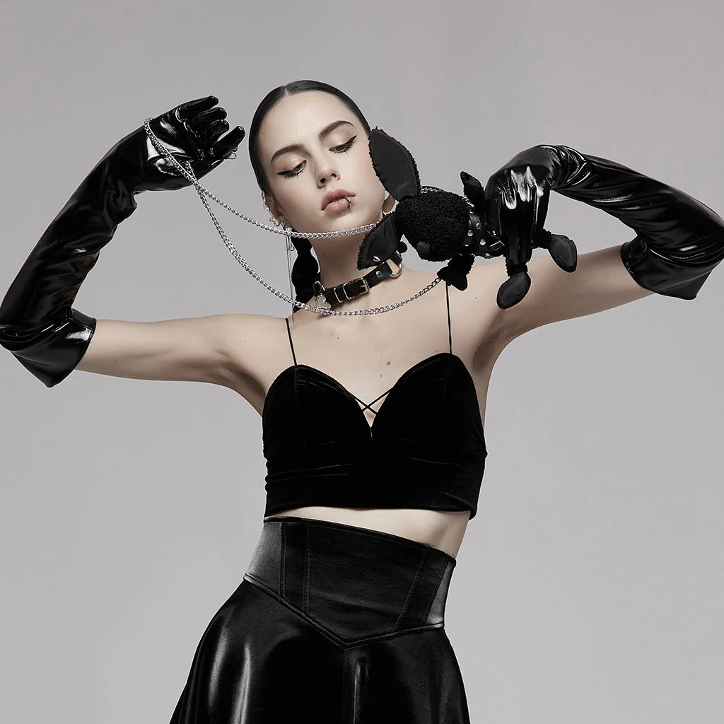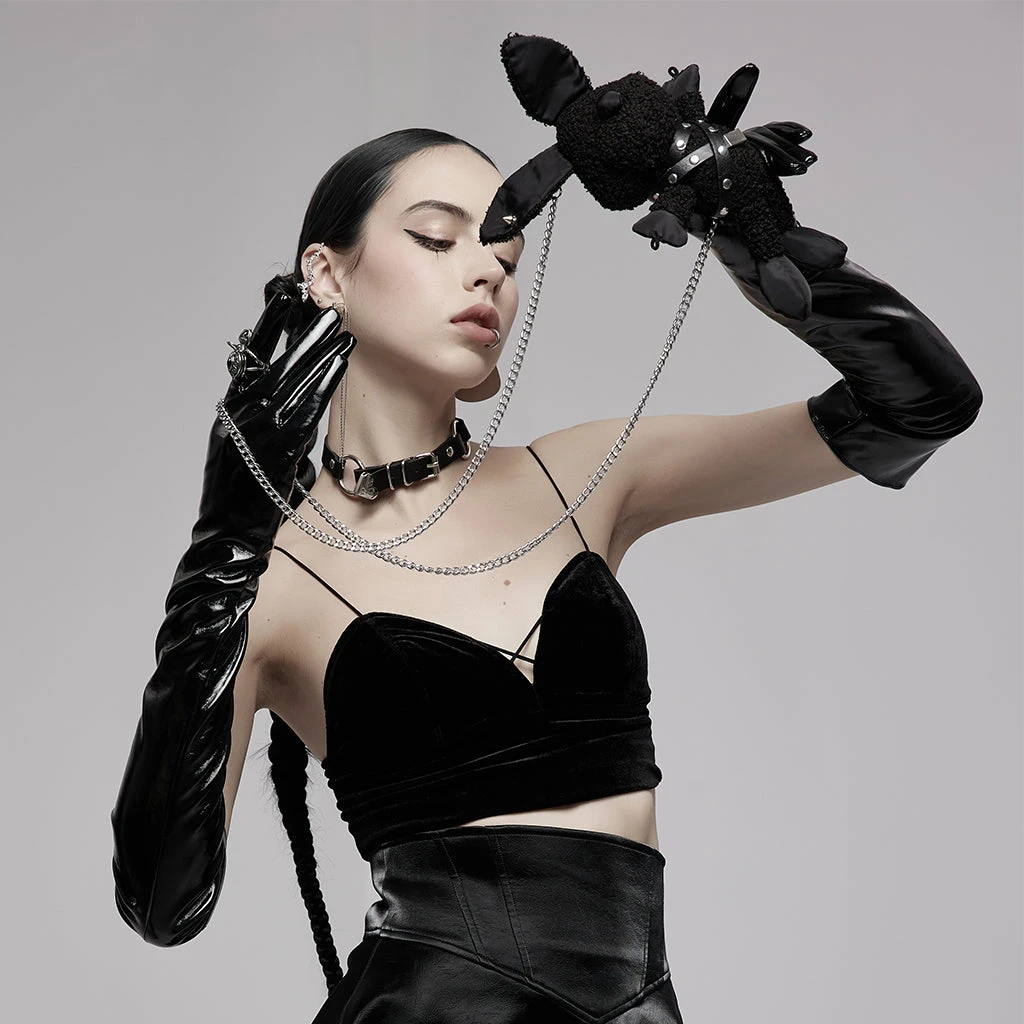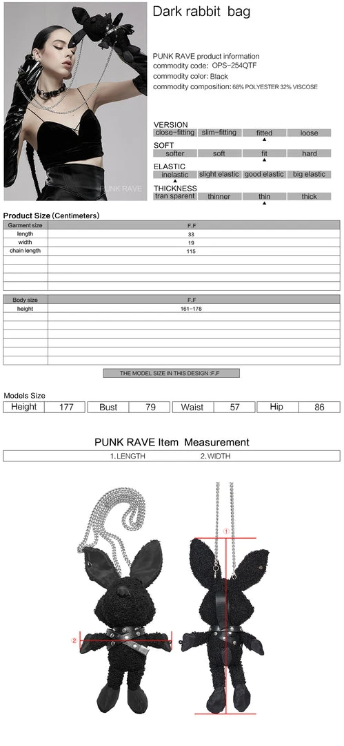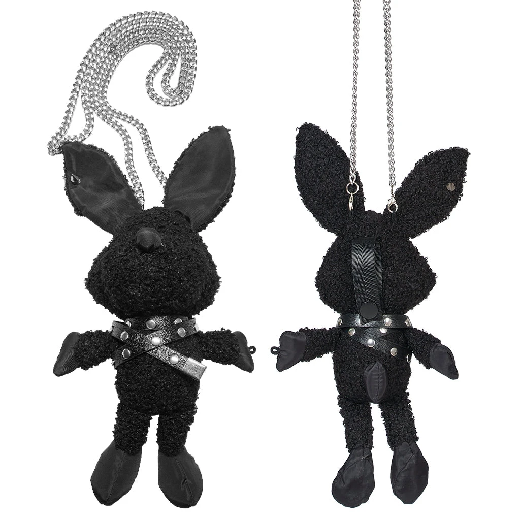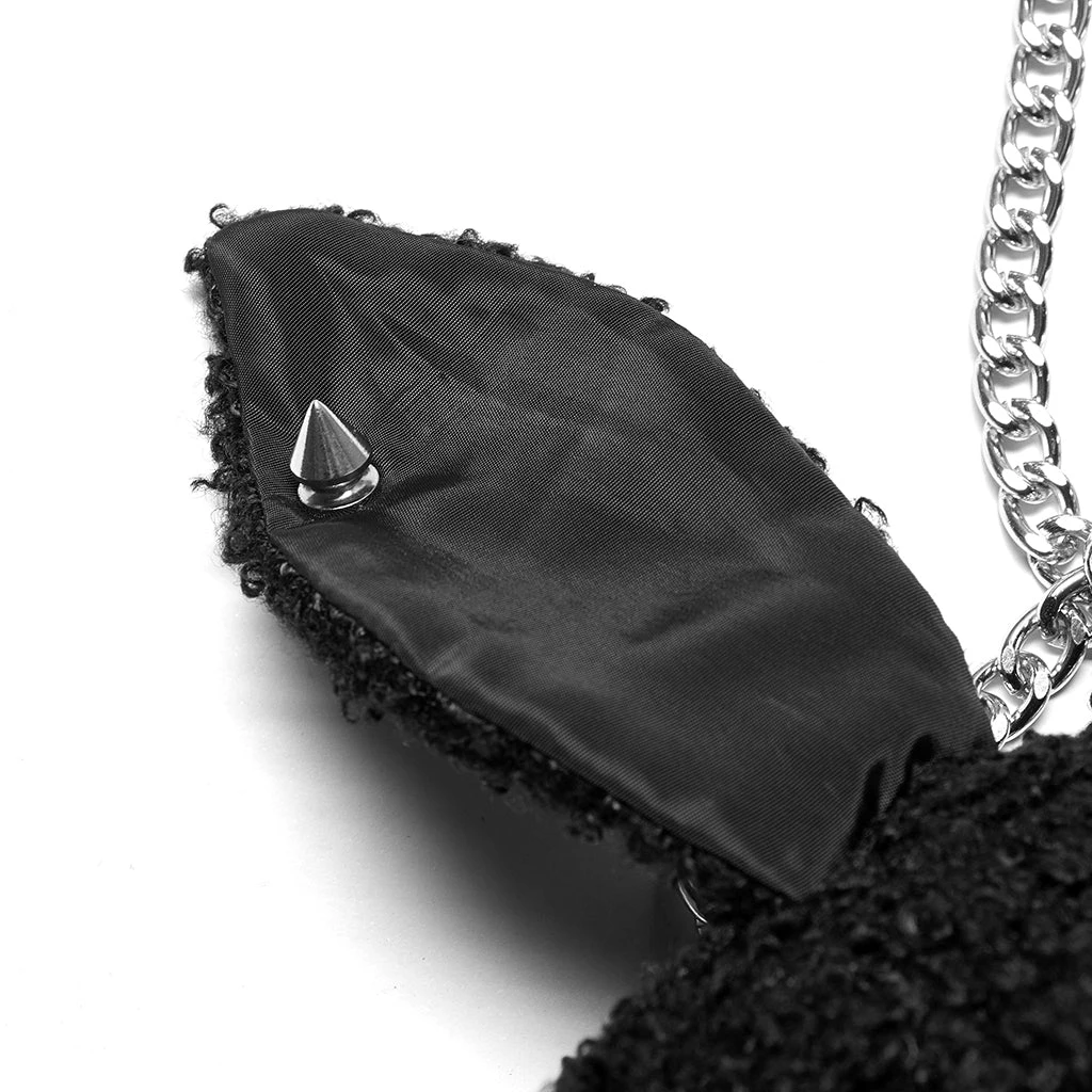 Unique and quirky black rabbit accessory from Punk Rave. This one of a kind fluffy rabbit comes with a long metal chain and faux leather strap detailing.
