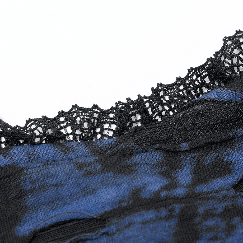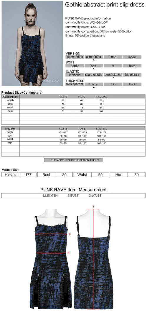 Striking blue and black mini dress from Punk Rave Gothic made from a soft stretchy fabric with a solid black lining. The Blue / black fabric features a tie dye effect with high thigh splits. This stunning dress also features adjustable shoulder straps for the perfect fit!