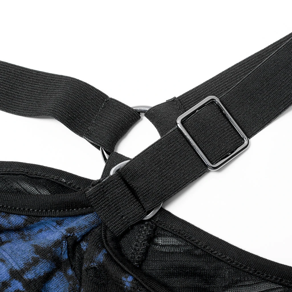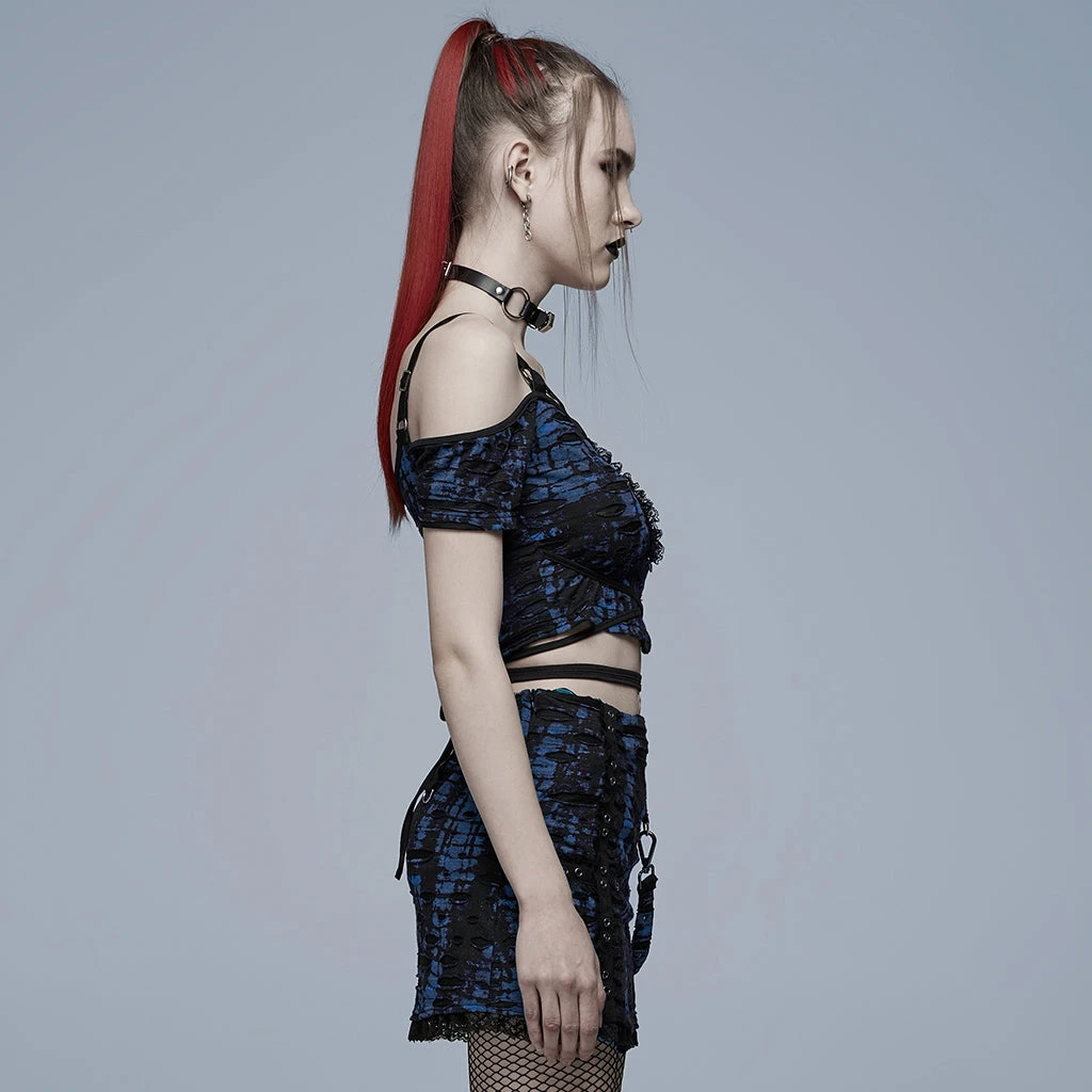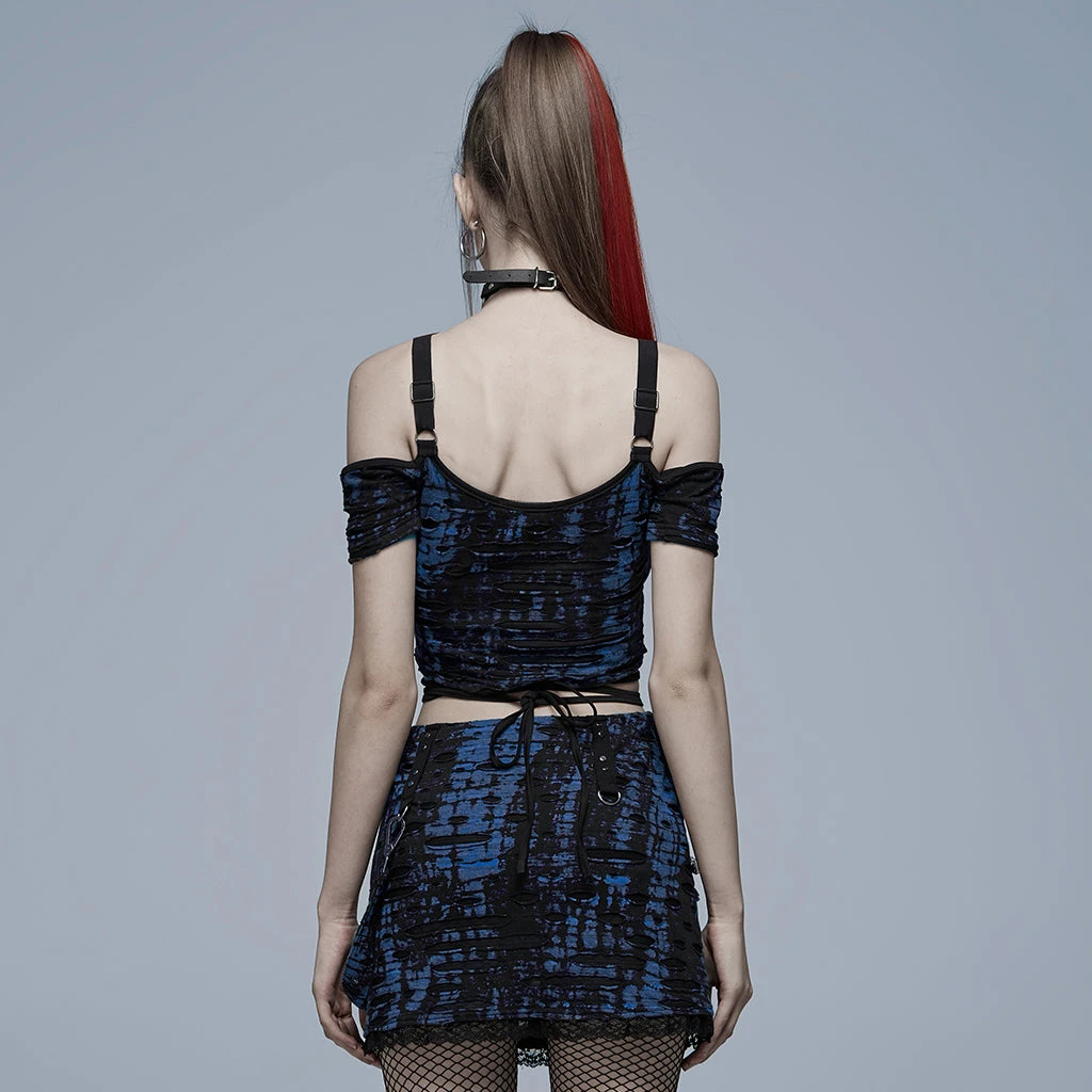 Stunning black and blue short sleeve crop top from Punk Rave Gothic made from a soft stretchy ragged fabric with a solid black lining. The black fabric features a dark blue tie dye effect with cold shoulders and a unique shoulder loop design. The belt has a binding rope, which can be wrapped around your waist and styled as you like.