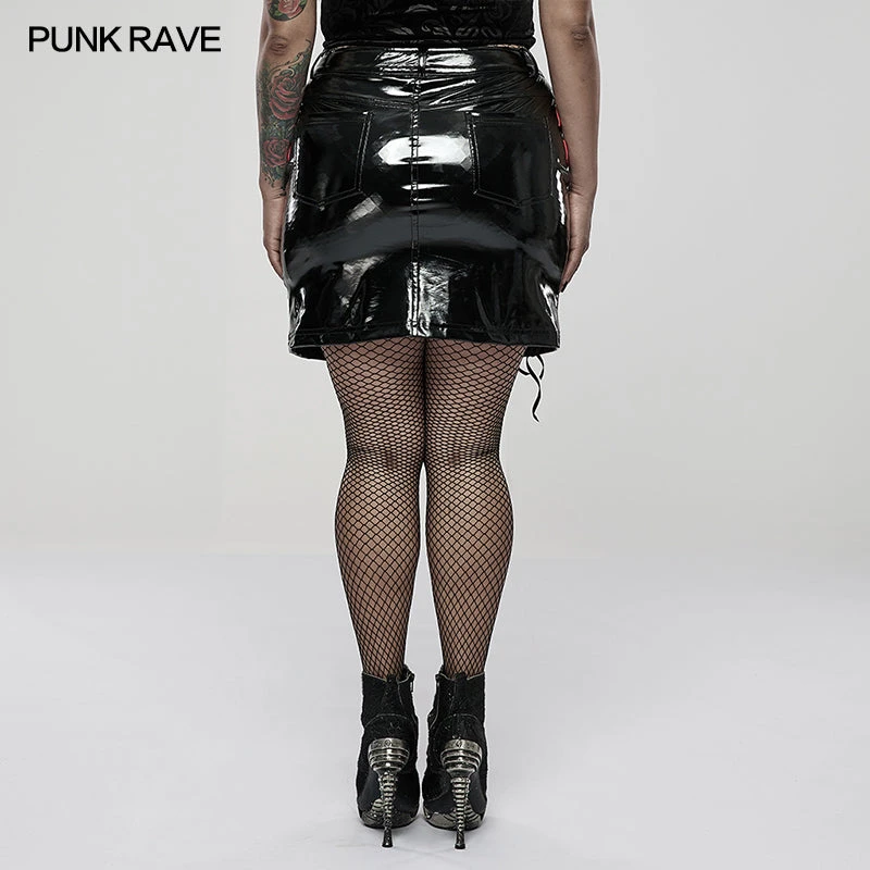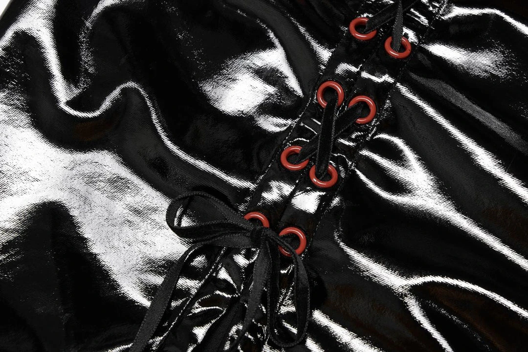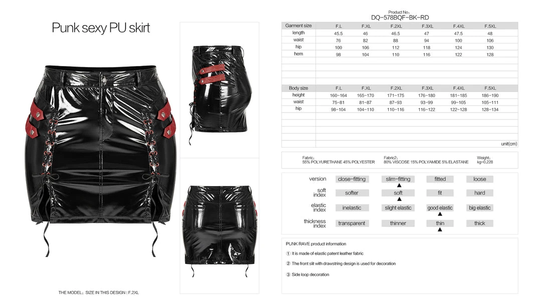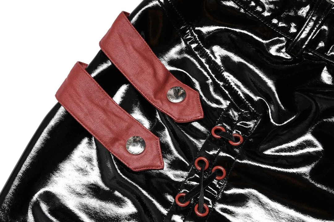 Striking PU mini skirt from Punk Rave featuring split detail to the thighs, velvet ribbon lacing with contrasting red eyelets and red strap accents to the sides. Fastening at the front with zip and button, this skirt looks fabulous on. For the perfect fit and fabric composition, please see Punk Rave’s size guide in the images.