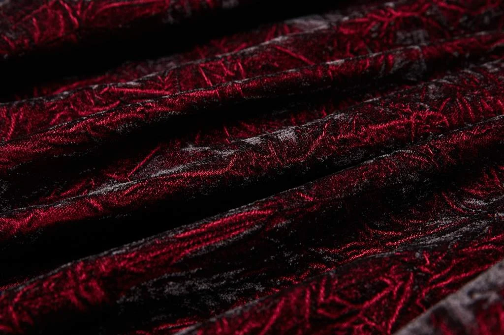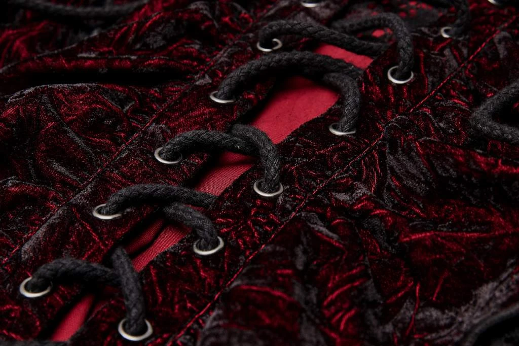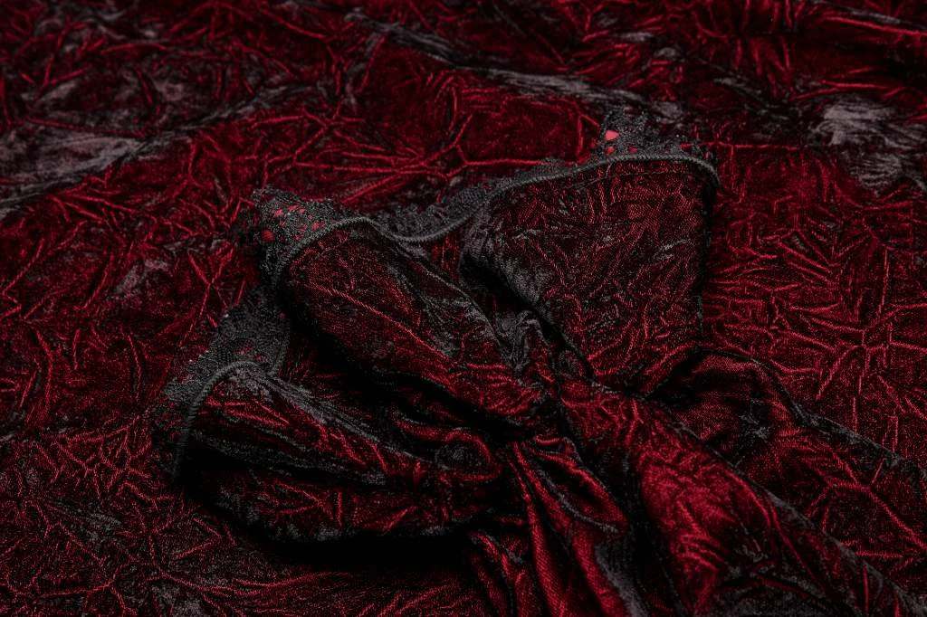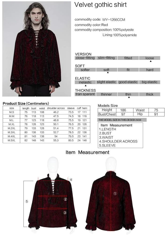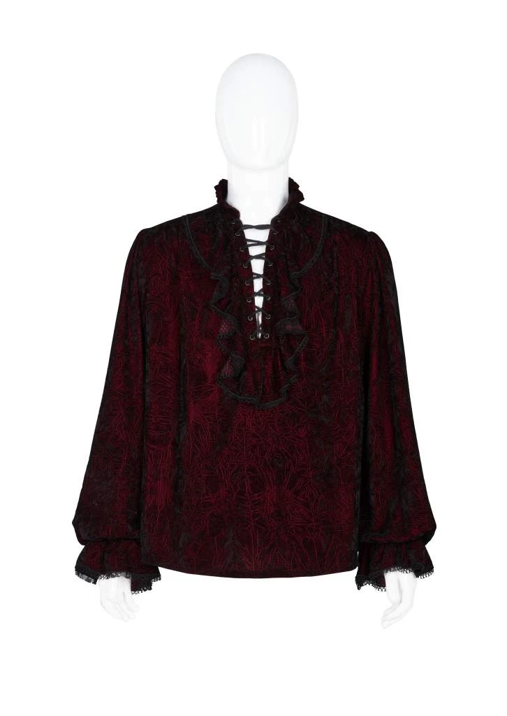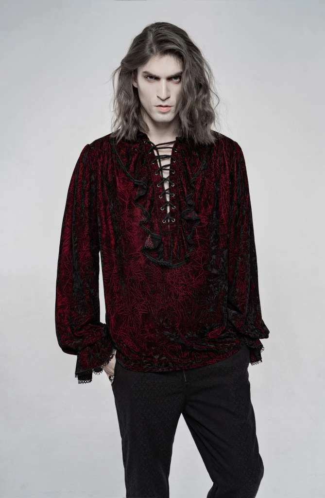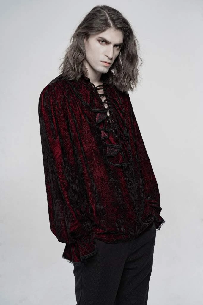Stunning piece of gothic mens clothing from Punk Rave! This amazing long sleeve top features bubble sleeves with black lace trimmed flared cuffs, V-neck split with black lace up detailing, black lace trimmed ruffled detailing and all in a luxurious crushed red velvet.