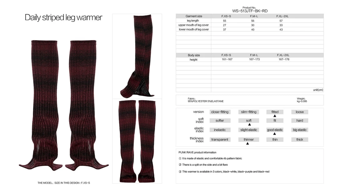 These awesome ribbed leg warmers from Punk Rave come in a black & red stripe. With splits to the side and a slight flare, these fabulous leg warmers look great on. For the perfect fit and fabric composition, please see Punk Rave’s size guide in the images
