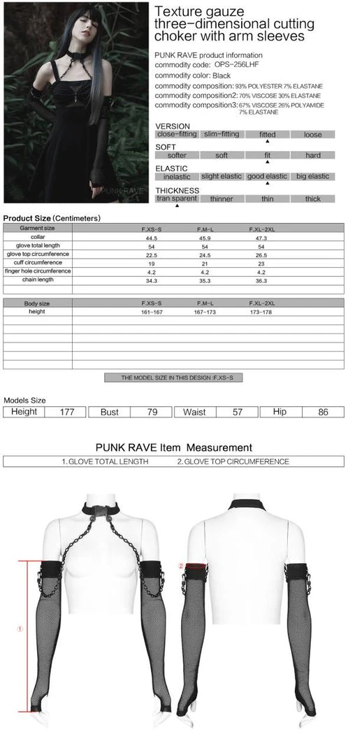 Beautiful fishnet sleeves from Punk Rave featuring thumb holes and detachable chains that links to a buckled adjustable choker. For the perfect fit and fabric composition, please see Punk Rave’s size guide in the images.