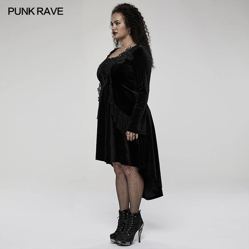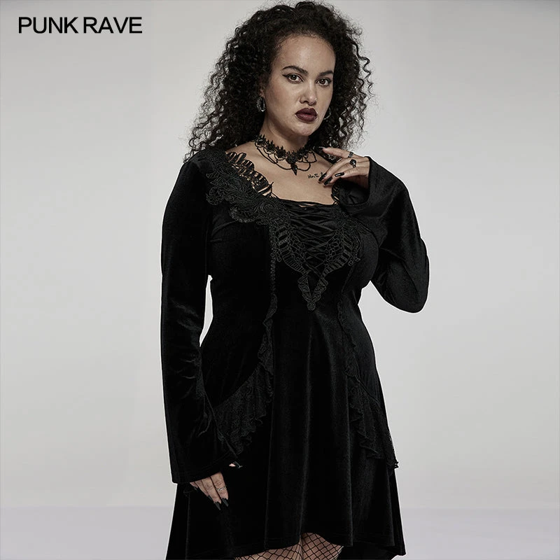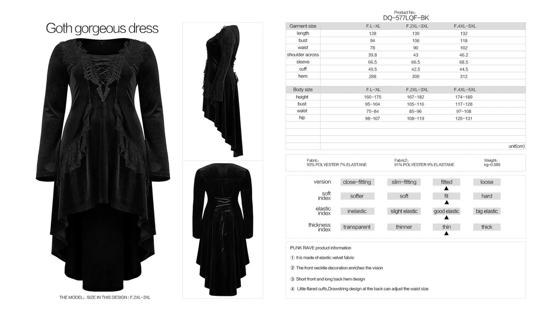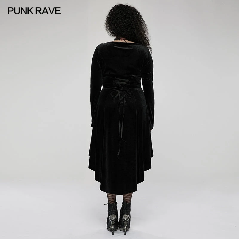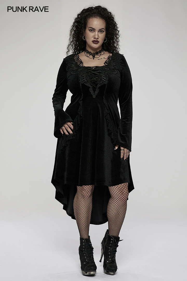 This gorgeous velvet dress from Punk Rave features long sleeves and a high/low hemline. With a stunning lace applique to the neckline, this lovely dress also has lace trim and ribbon lacing to the front and back. For the perfect fit and fabric composition, please see Punk Rave’s size guide in the images.