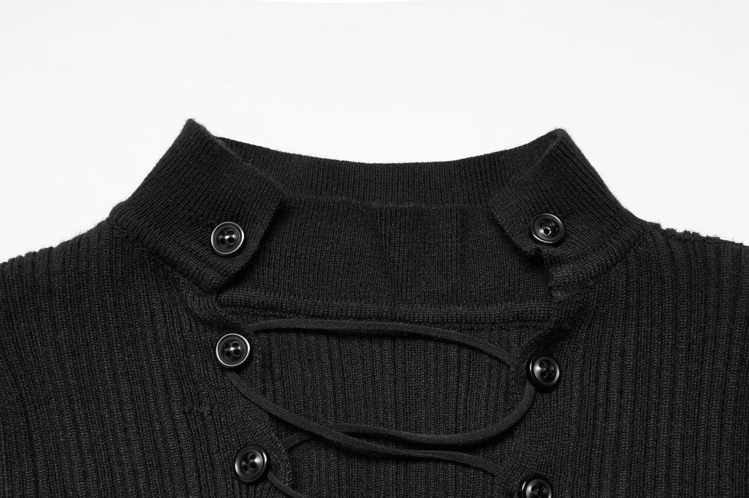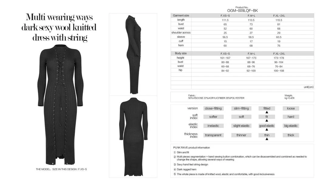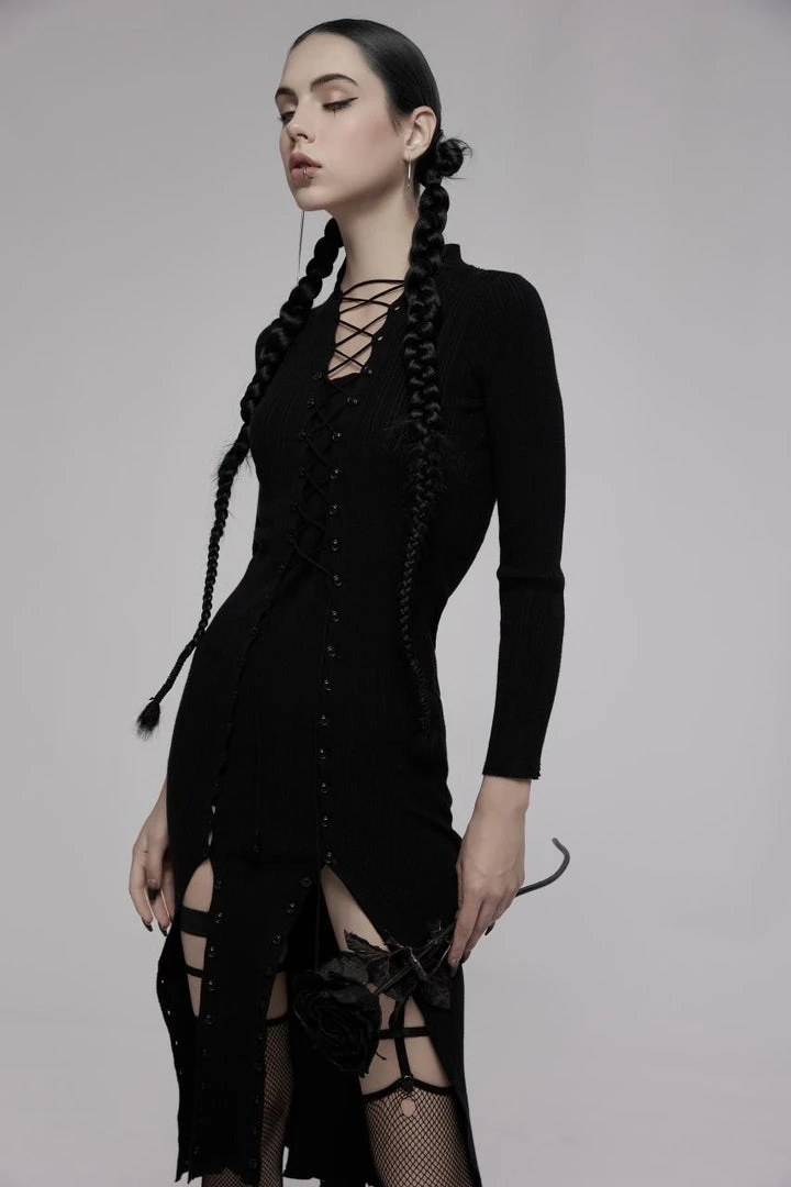 This stunning midi dress from Punk Rave comes in a lovely soft knit rib. Featuring a distressed hemline, long sleeves with distressed cuffs and a high neckline. The centre panel fastens with buttons with lace up detail and can be worn high or lower depending on your mood. For the perfect fit and fabric composition, please see Punk Rave’s size guide in the images.