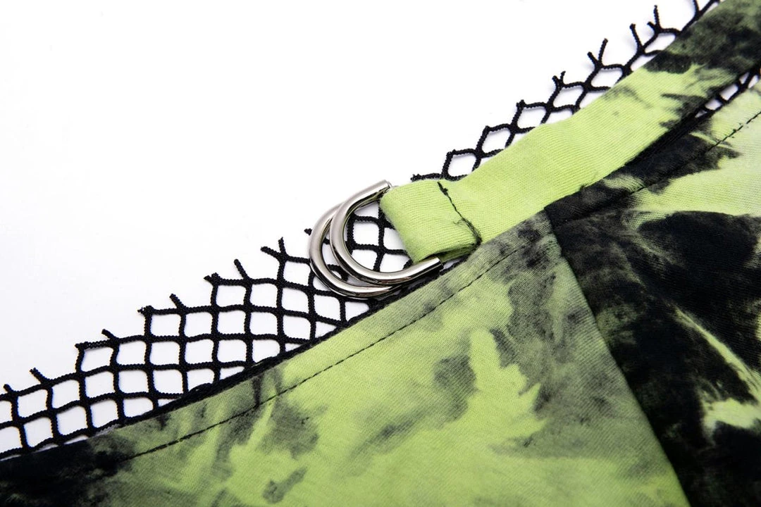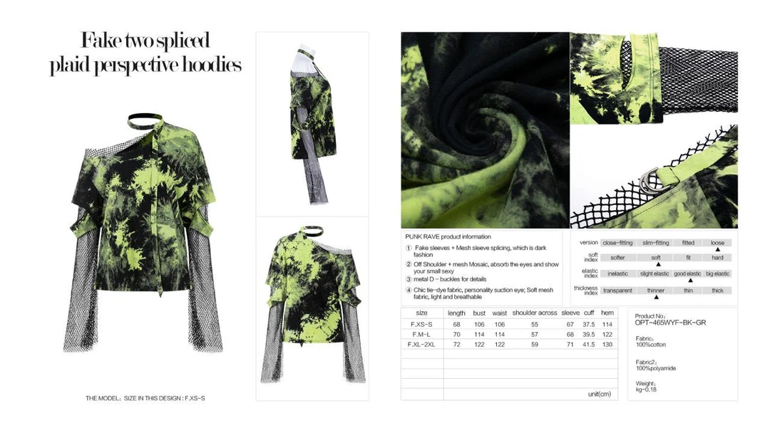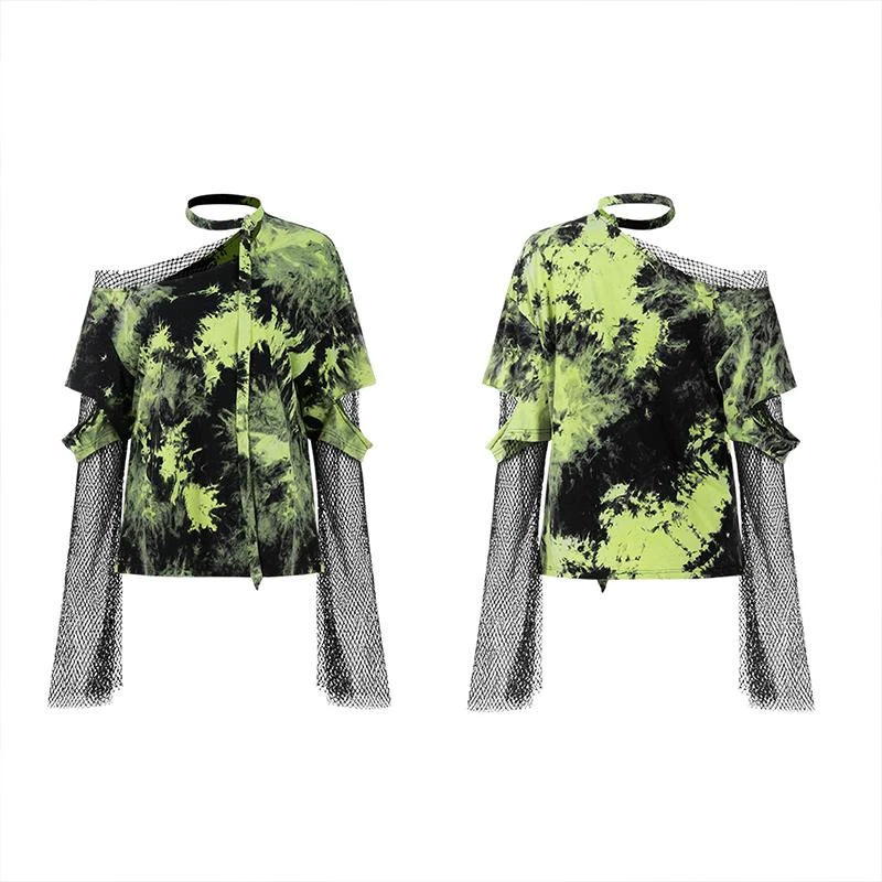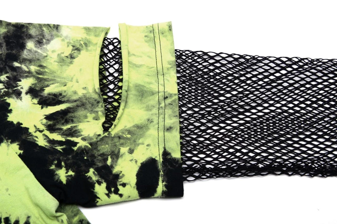 This lovely tie-dye top from Punk Rave features long mesh sleeves and mesh trim to the asymmetric neckline. With a matching fabric choker, for the perfect fit please see Punk Rave’s size guide in the images.