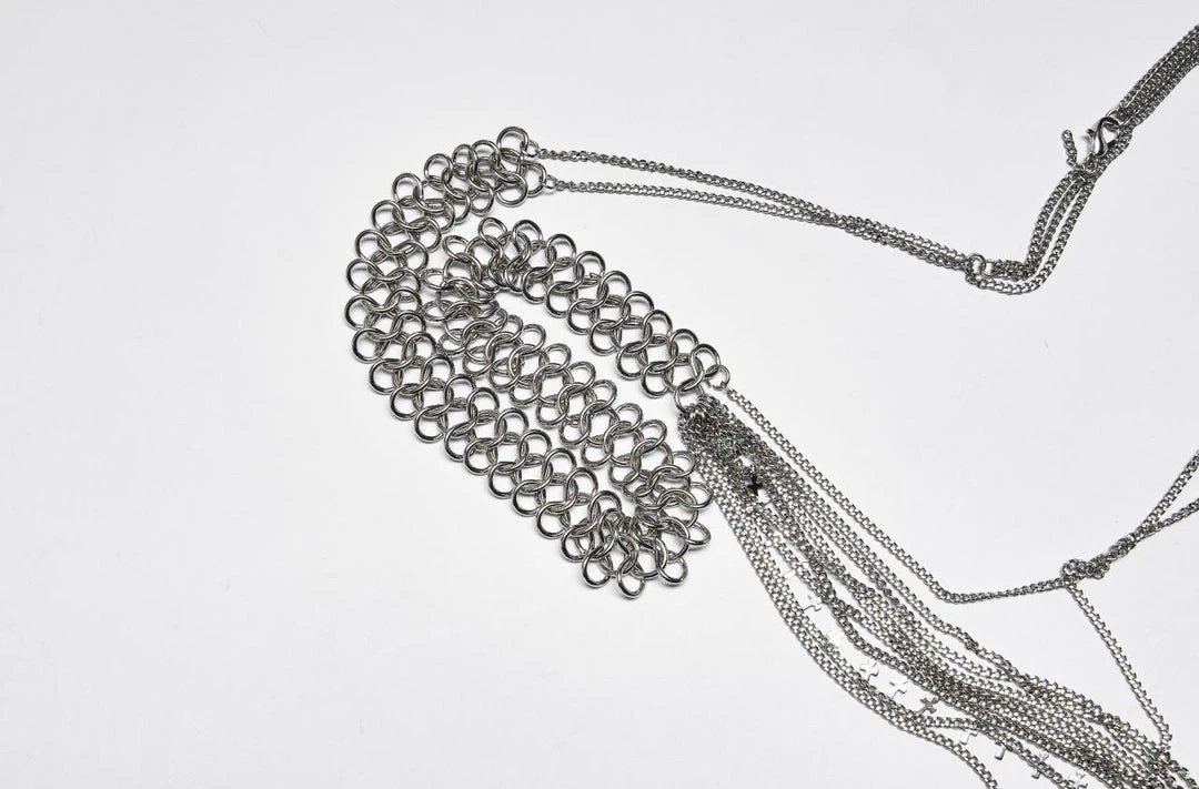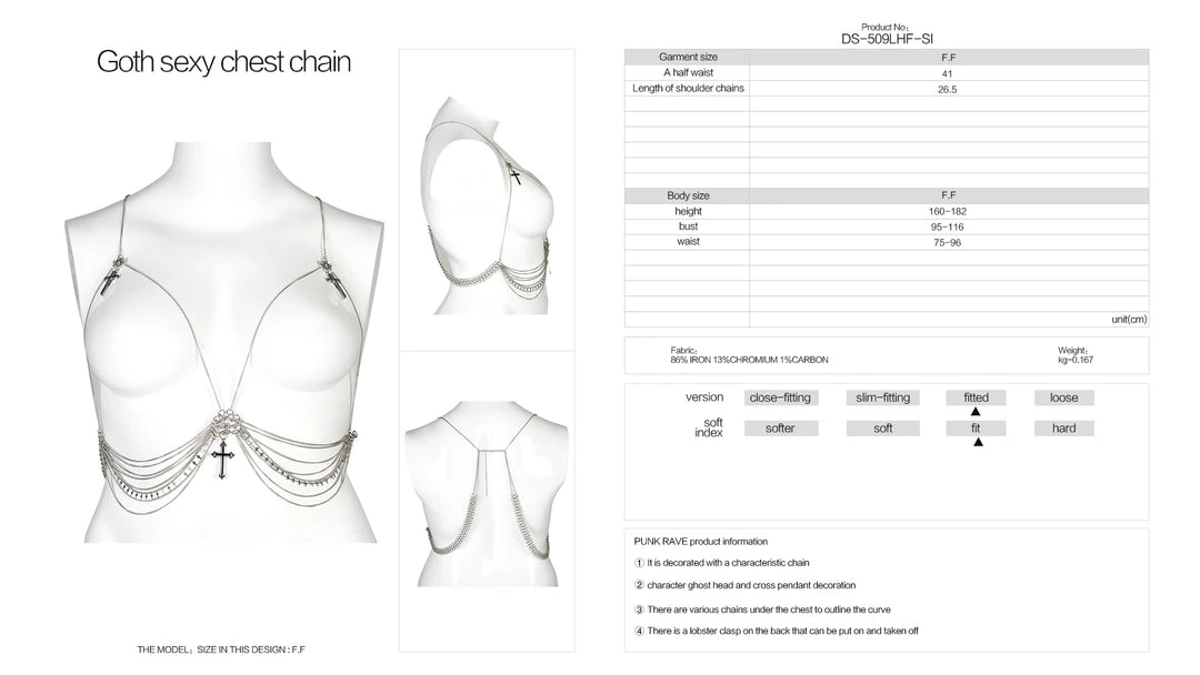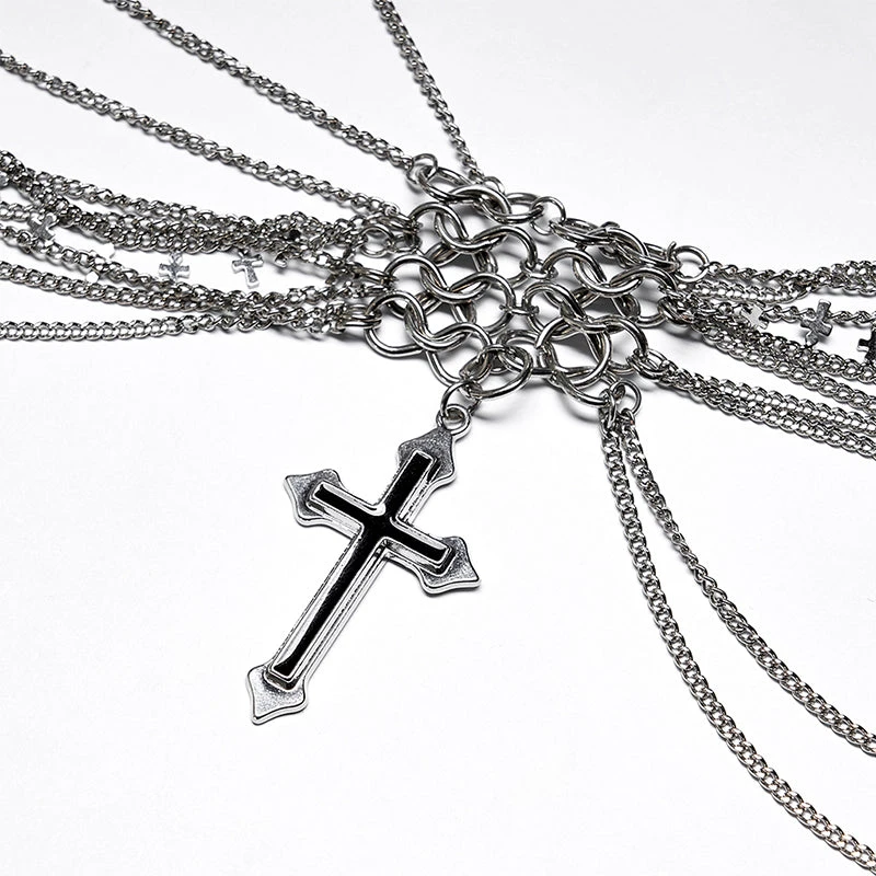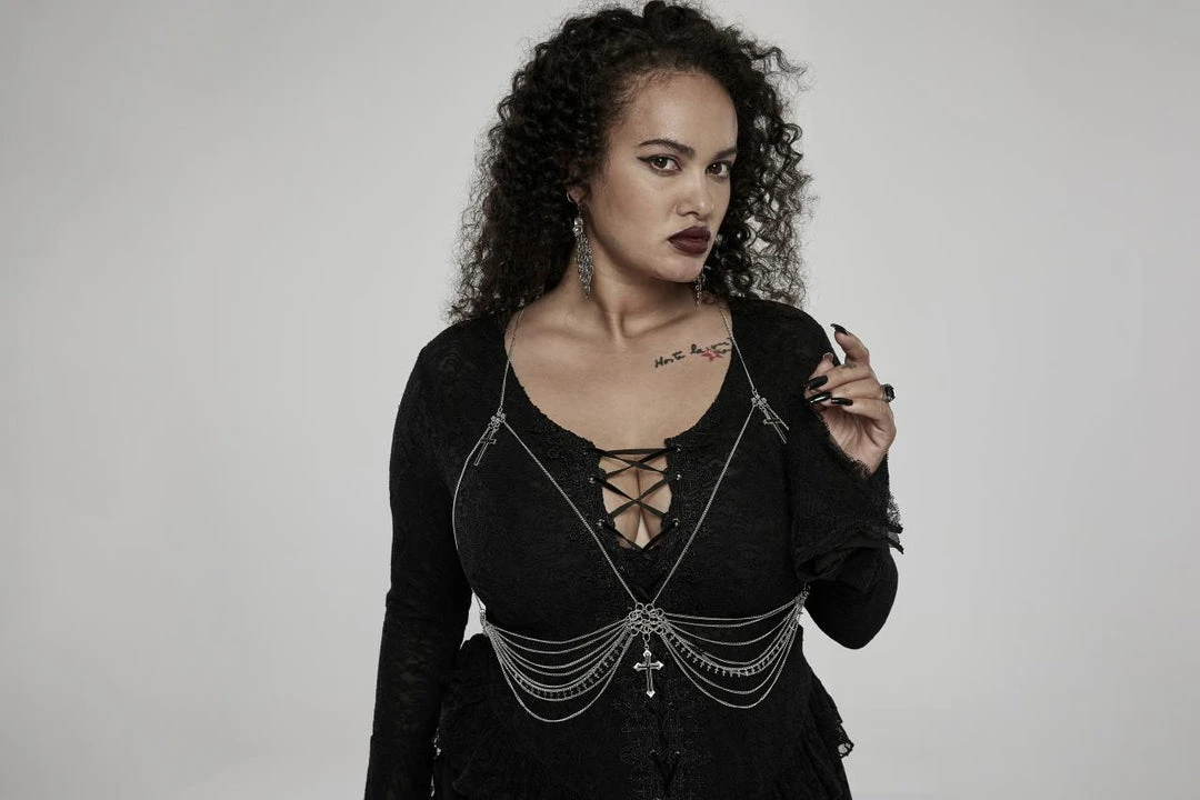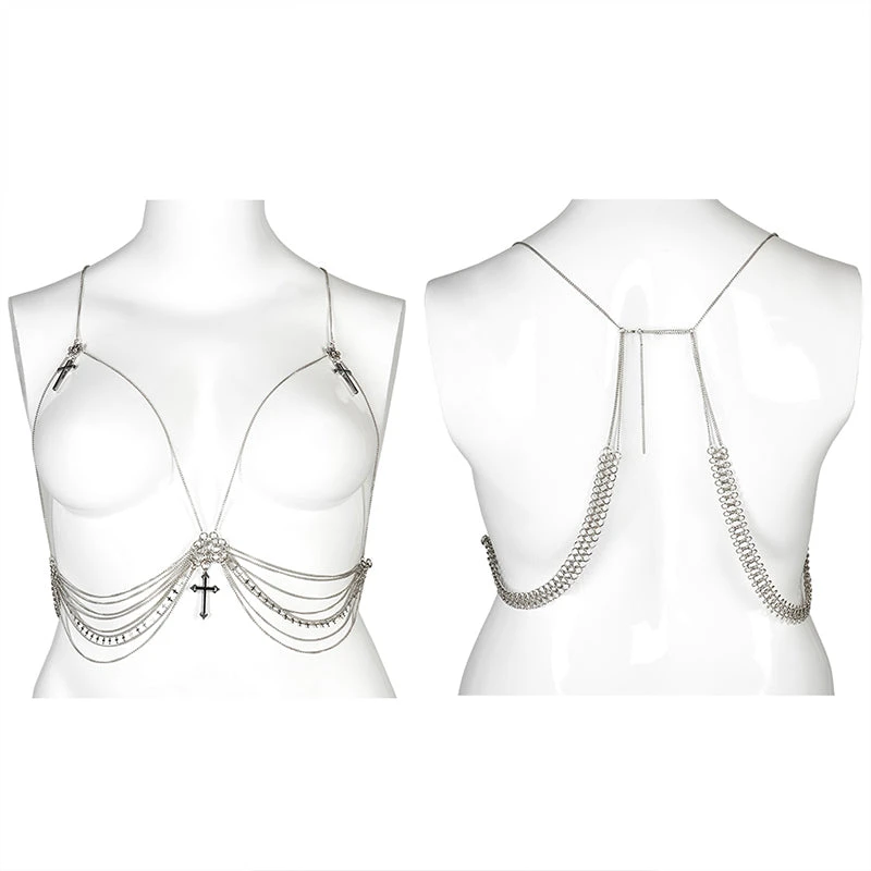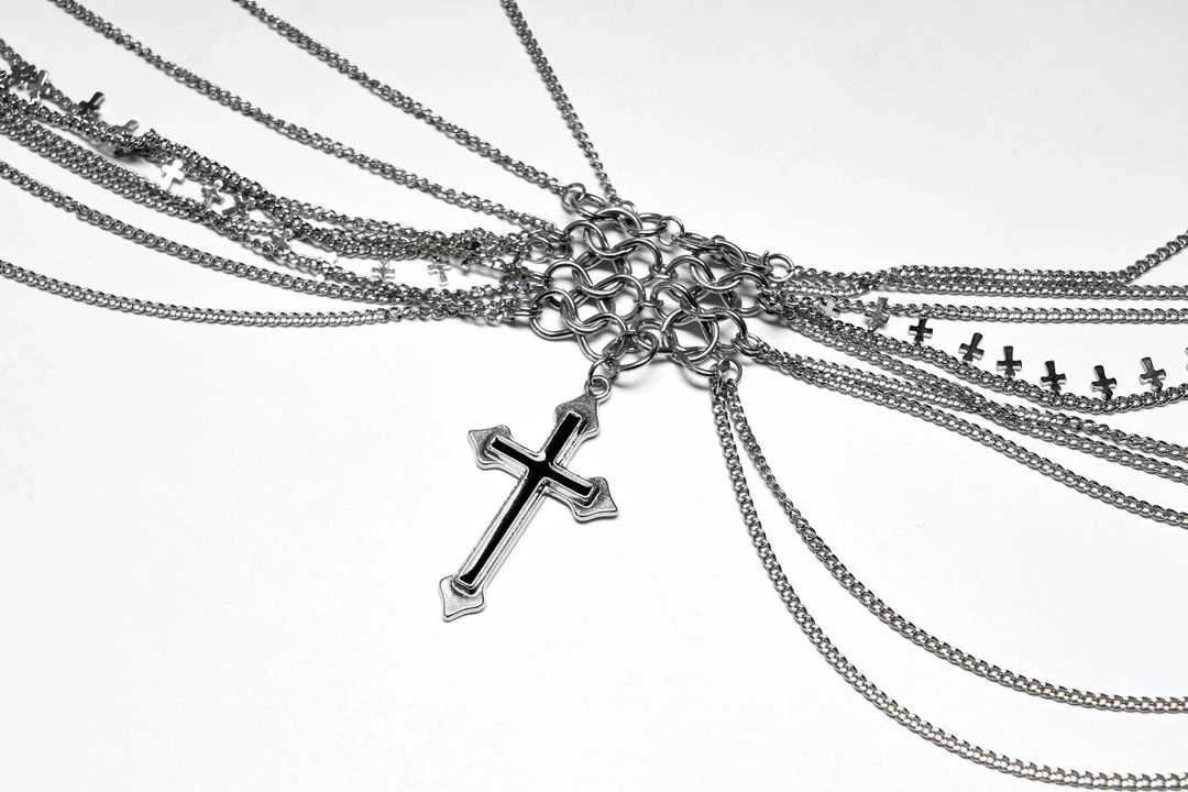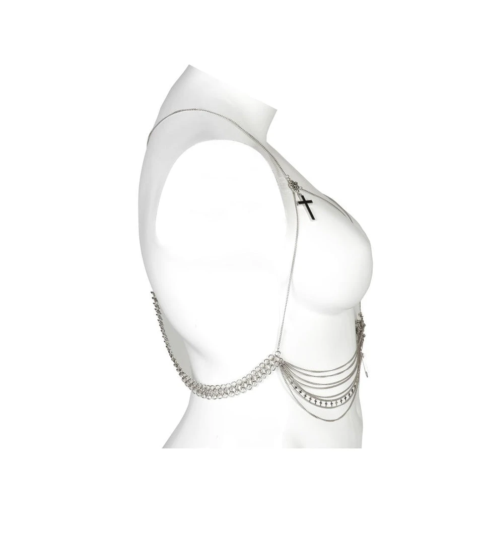 The perfect accessory from Punk Rave! This gorgeous chain harness fastens with a lobster clap to the back and features layered chains and cross pendants. For the approximate measurement and composition, please see the size guide in the images.