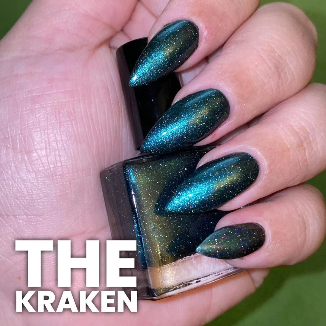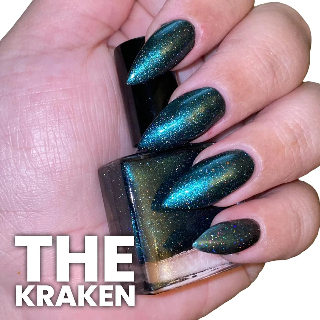 Radioactive The Kraken Nail Polish 10ml: Eye Catching deep emerald green colour nail polish! Features glitter flakes and maximum visual impact!