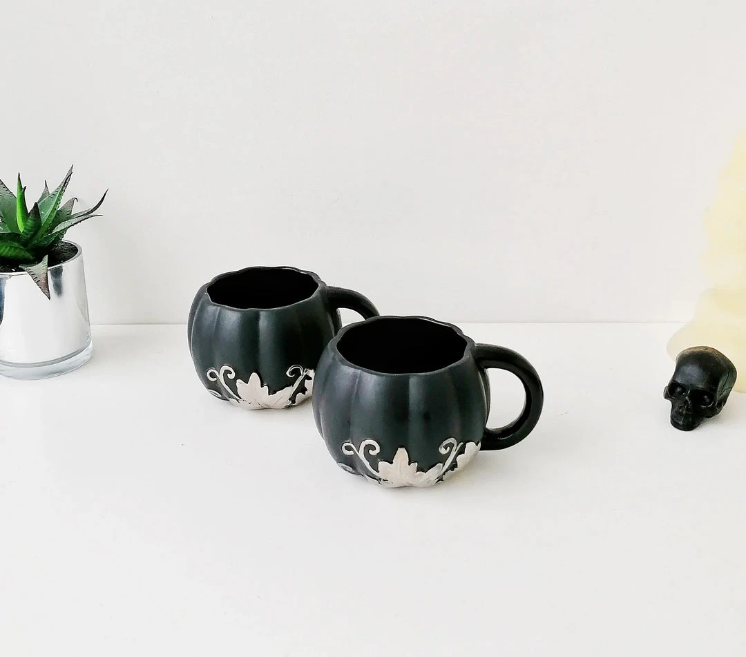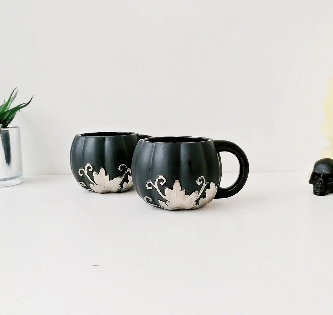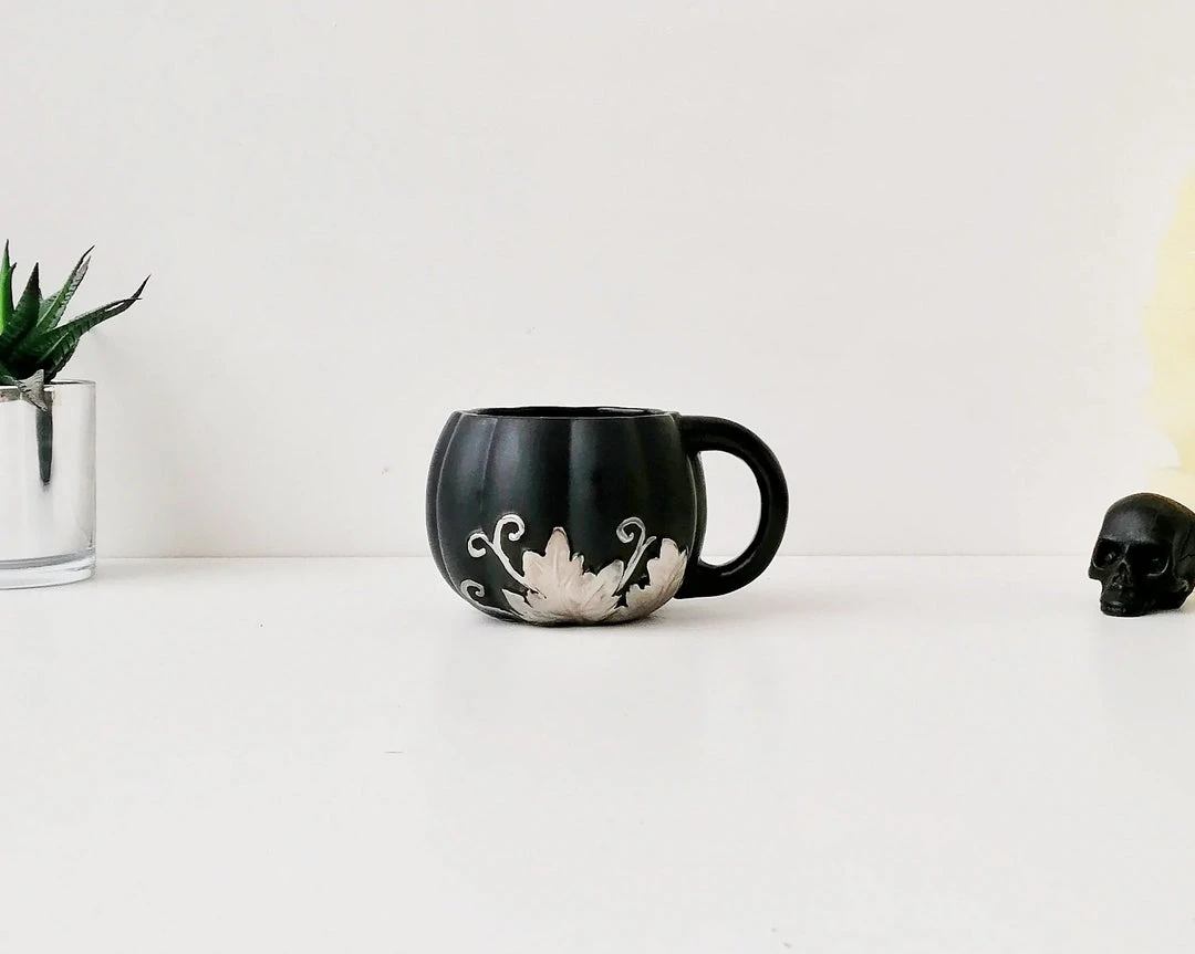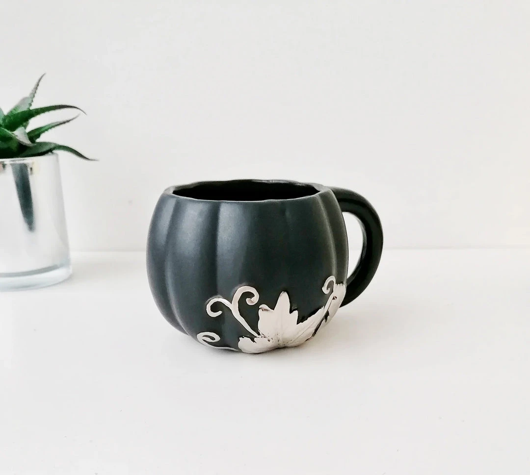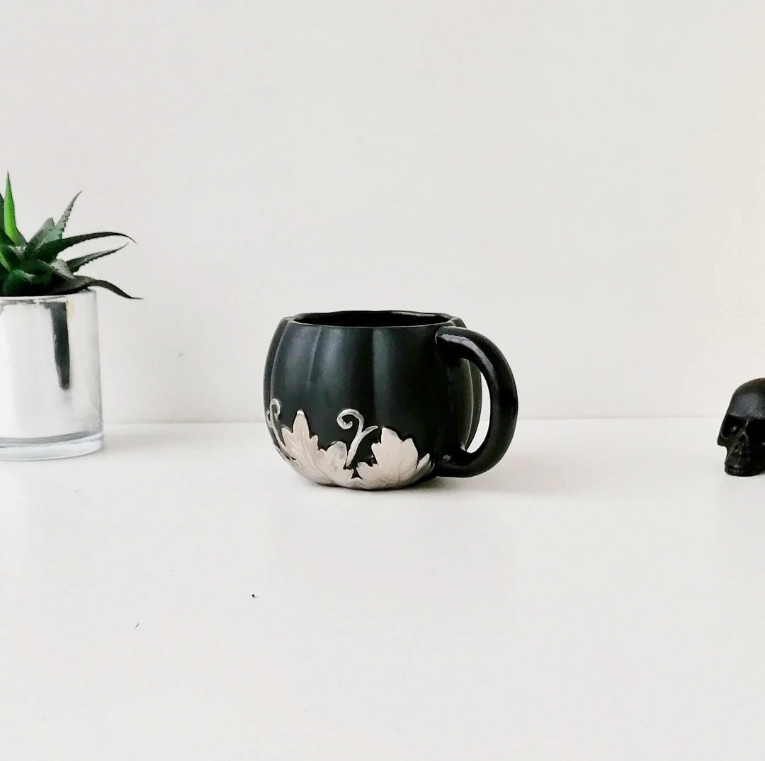 This amazing mug from Weird & Wonderful Ceramics has a pumpkin shape and large handle. With a matte black glaze and silver foliage design, this is the perfect mug for your favourite beverage.