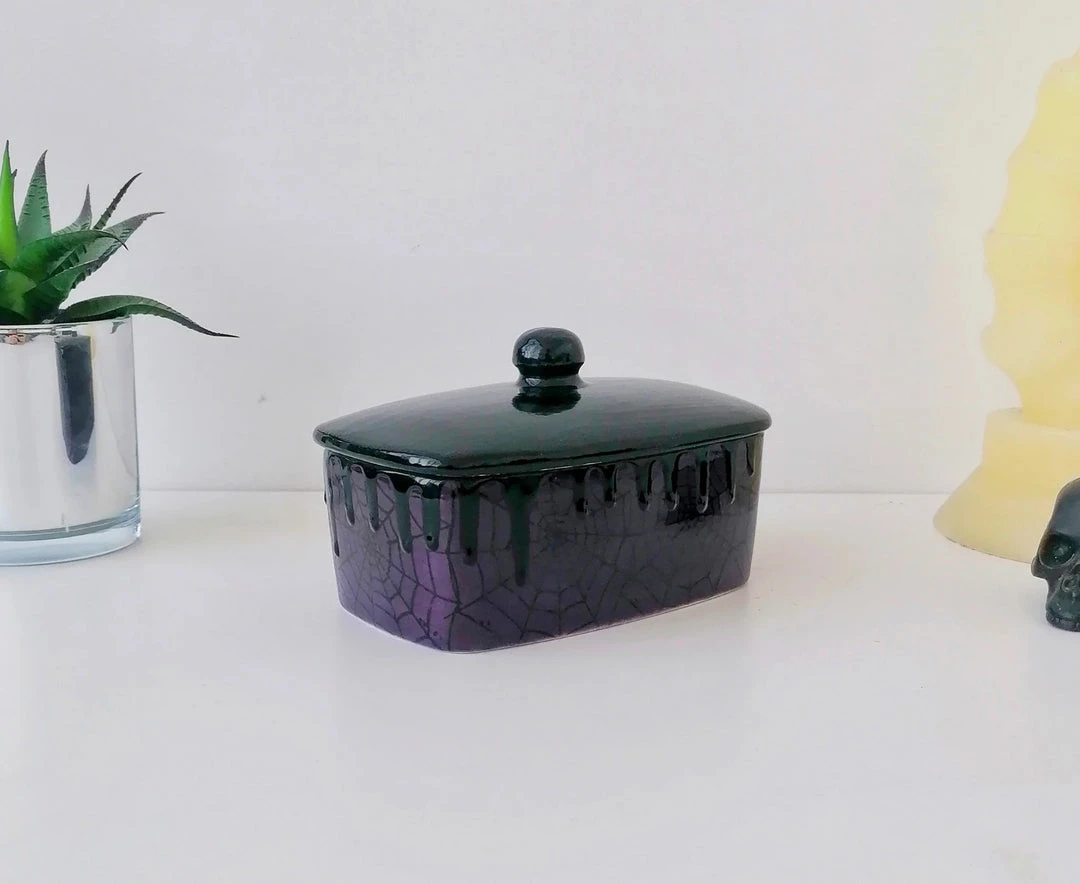 Fantastic lidded butter bowl from Weird & Wonderful Ceramics! With a matte black glaze and black bats design, this is the perfect piece of kitchenware for your Gothic home.