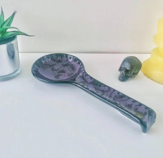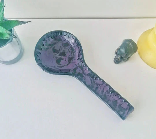 Amazing large spoon rest from Weird & Wonderful Ceramics! With a black glaze and purple skull design, this is the perfect piece of kitchenware for your Gothic home.