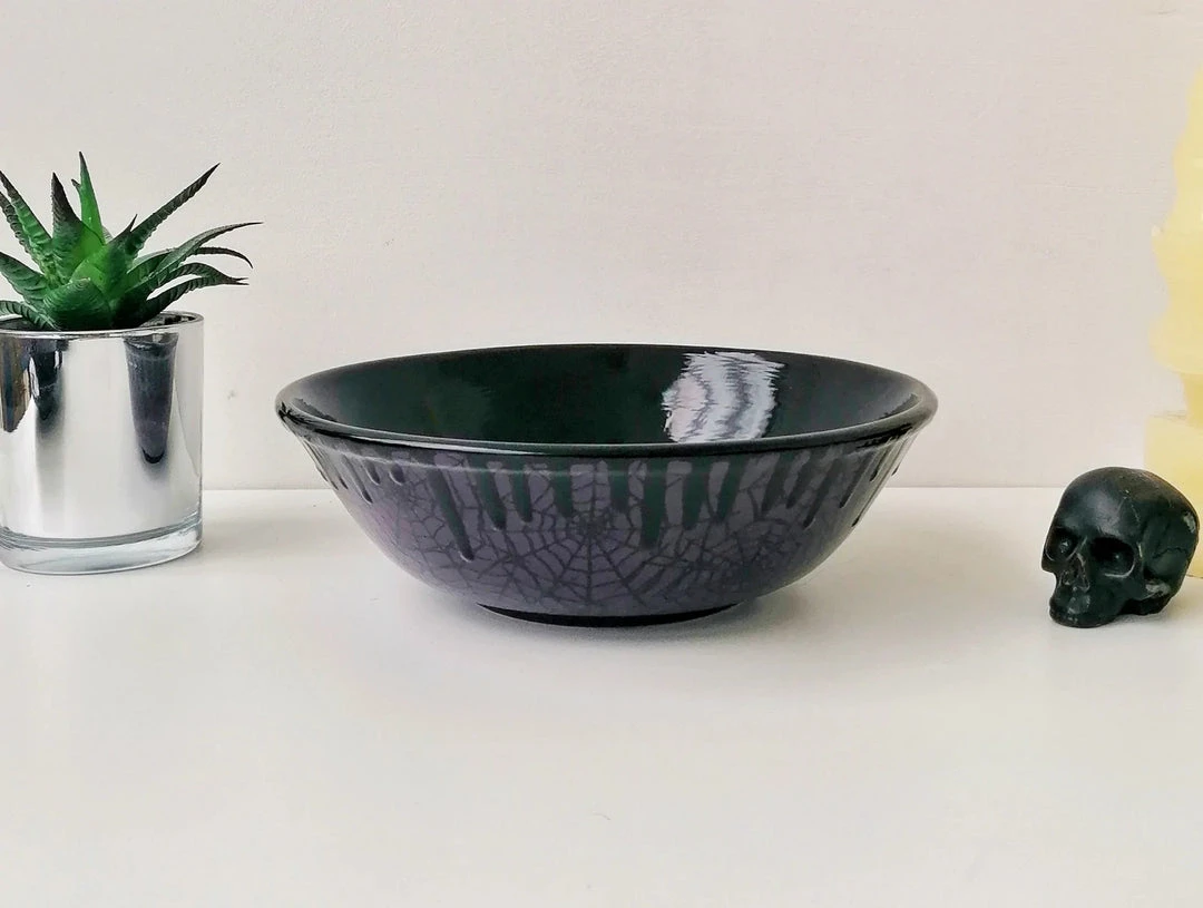 Amazing large pasta bowl from Weird & Wonderful Ceramics! With a purple glaze and black web design, this is the perfect piece of kitchenware for your Gothic home.